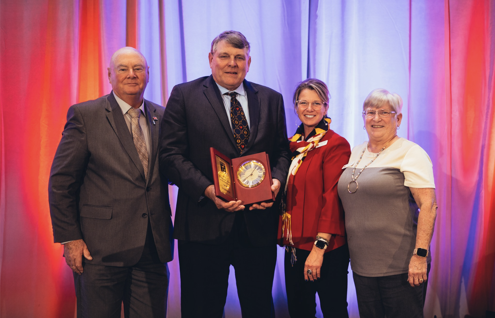 Steve Walter Accepts Distinguished Service Award (L to R: MDFB President Jamie Raley, Charles County farmer Steve Walters, MDFB 1st Vice President Jo-Ann Chason, and MDFB 2ndVice President Chris Catterton)
